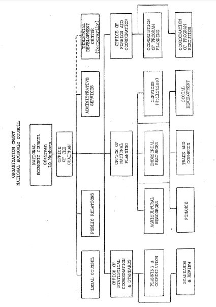 Section 2. The Council organization, as indicated in the following organization chart, shall consist of the Council proper, the Office of the Chairman and three staff offices consisting of the Office of National Planning, the Office of Foreign Aid Coordination, and the Office of Statistical Coordination and Standards. The Office of the Chairman shall have three staff services, namely, Legal Counsel, Public Relations, and Administrative Services. The Office of National Planning shall have six branches consisting of the Agricultural Resources Branch, Industrial Resources Branch, Services (Utilities) Branch, Finance Branch, Trade and Commerce Branch, and Social Development Branch. The Office of Foreign Aid Coordination shall have two branches, namely, the Coordination of Program Planning Branch and the Coordination of Program Execution Branch. The Office of Statistical Coordination and Standards shall have two branches, namely, the Planning and Coordination Branch and the Standards and Review Branch.